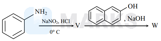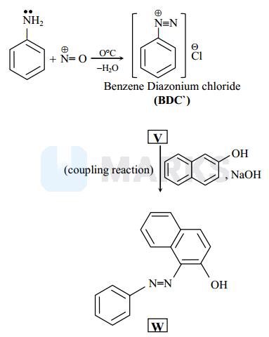 Aniline form benzene diazonium salt on reaction with (V) which gives coupling reaction 2-naphthol.